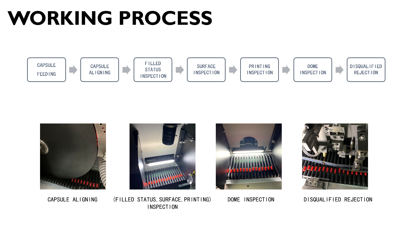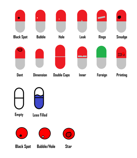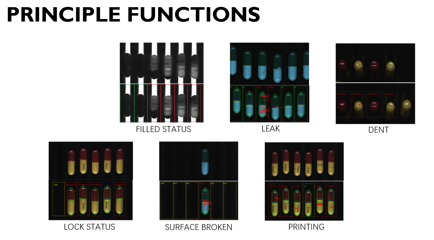 可檢測缺陷 Functions | 頂凹、空囊、部份充填、插劈、開裂、未鎖緊、氣泡、黑點、圖案印刷不良、異種膠囊等各種缺陷 dimension, uncut, thin spot, bad incision, spots, bubbles, casing damage, wrinkles, ?foreign capsules, printing, etc.. |